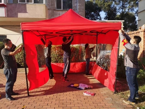 在全員核酸檢測時,工力所社區(qū)居民多已年長,部分人員身體狀況不佳,長時間排隊情緒容易焦躁,體力也吃不消。對此,現(xiàn)場工作組積極協(xié)調(diào),第一時間為社區(qū)提供塑料座椅,供居民臨時休息。現(xiàn)場工作人員長時間指揮嗓子干啞,支部立即調(diào)配擴音器、引導(dǎo)線等,輔助維持現(xiàn)場秩序。聞息近期有雨,又緊急增配雨衣,以免影響檢測工作。接到第四輪核酸檢測點遷移指令后,工作組又緊急集結(jié),在居民區(qū)空地搭設(shè)帳篷,設(shè)置排隊引導(dǎo)線、隔離樁,調(diào)試設(shè)備設(shè)施,有效保證核酸檢測工作順利進行。