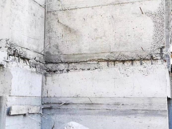 據(jù)上述建筑不遠(yuǎn)處有一棟在建10層建筑(圖3),形狀不太規(guī)則,可以看到墻肢底部的彎曲型破壞和連梁的破壞(圖4、圖5),上部結(jié)構(gòu)未觀察到損傷,整體結(jié)構(gòu)依然站立。