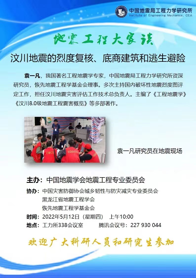 主題講座。5月12日,為提升全社會防災減災能力,我所舉辦了“地震工程大家談”主題講座,邀請了我所袁一凡研究員在線上作了題為《汶川地震的烈度復核、底商建筑和逃生避險》報告。