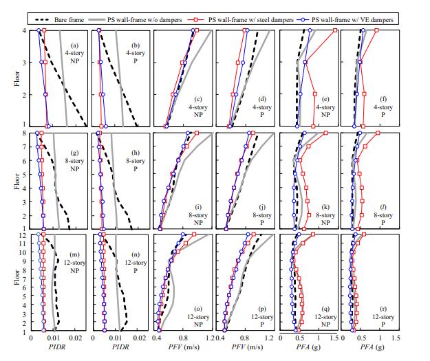鉸支墻可以增加結(jié)構(gòu)沿高度方向的連續(xù)剛度并使層間位移分布更為均勻,從而避免框架結(jié)構(gòu)出現(xiàn)薄弱層破壞。然而,現(xiàn)有研究對鉸支墻-框架結(jié)構(gòu)的樓面速度和加速度反應(yīng)關(guān)注較少,而這些反應(yīng)主導(dǎo)了建筑物非結(jié)構(gòu)構(gòu)件的地震損傷。本文通過數(shù)值模擬評估了鉸支墻-框架結(jié)構(gòu)的樓面速度和加速度反應(yīng),重點(diǎn)研究了使用不同類型阻尼器對其的影響。此外,還通過結(jié)合最大峰值層間位移角、平均峰值樓面速度和平均峰值樓面加速度作為工程需求參數(shù)進(jìn)行了多維地震易損性分析。