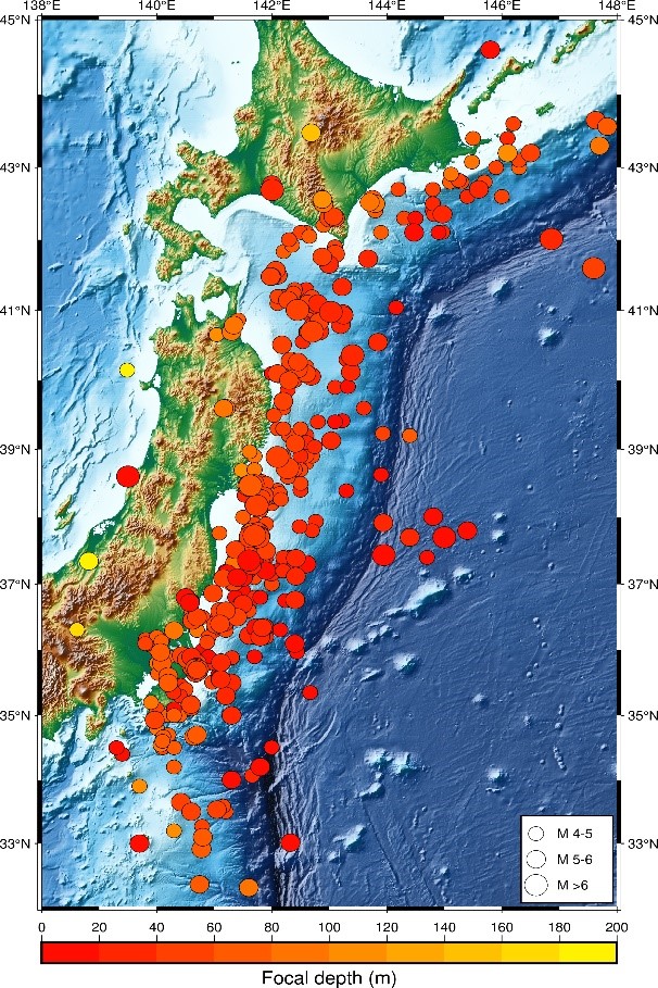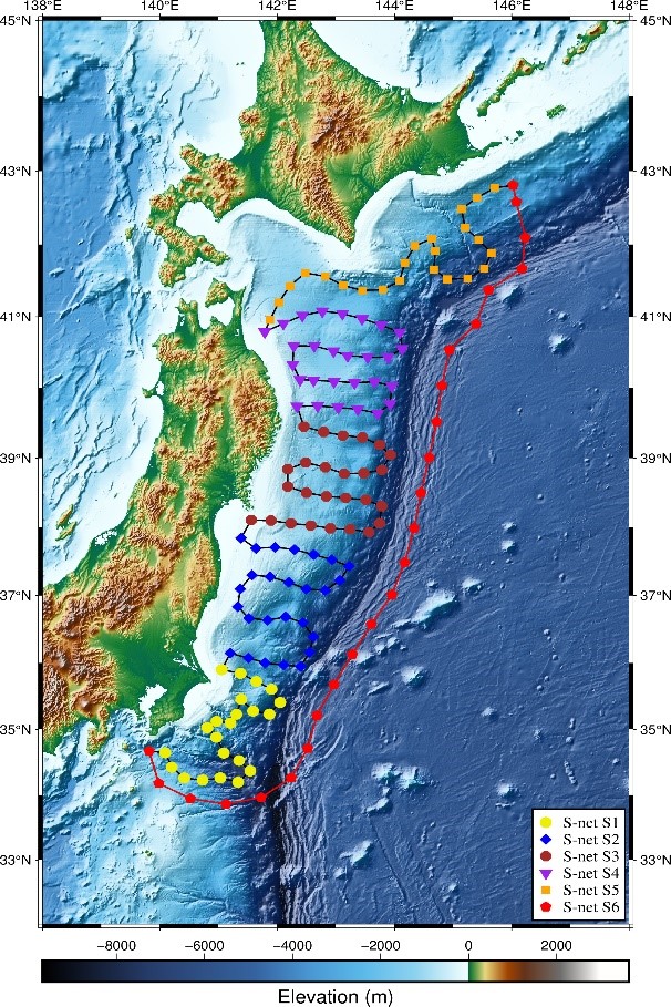 圖1 (a) 日本S-net海底臺站分布圖, (b) 地震事件分布圖