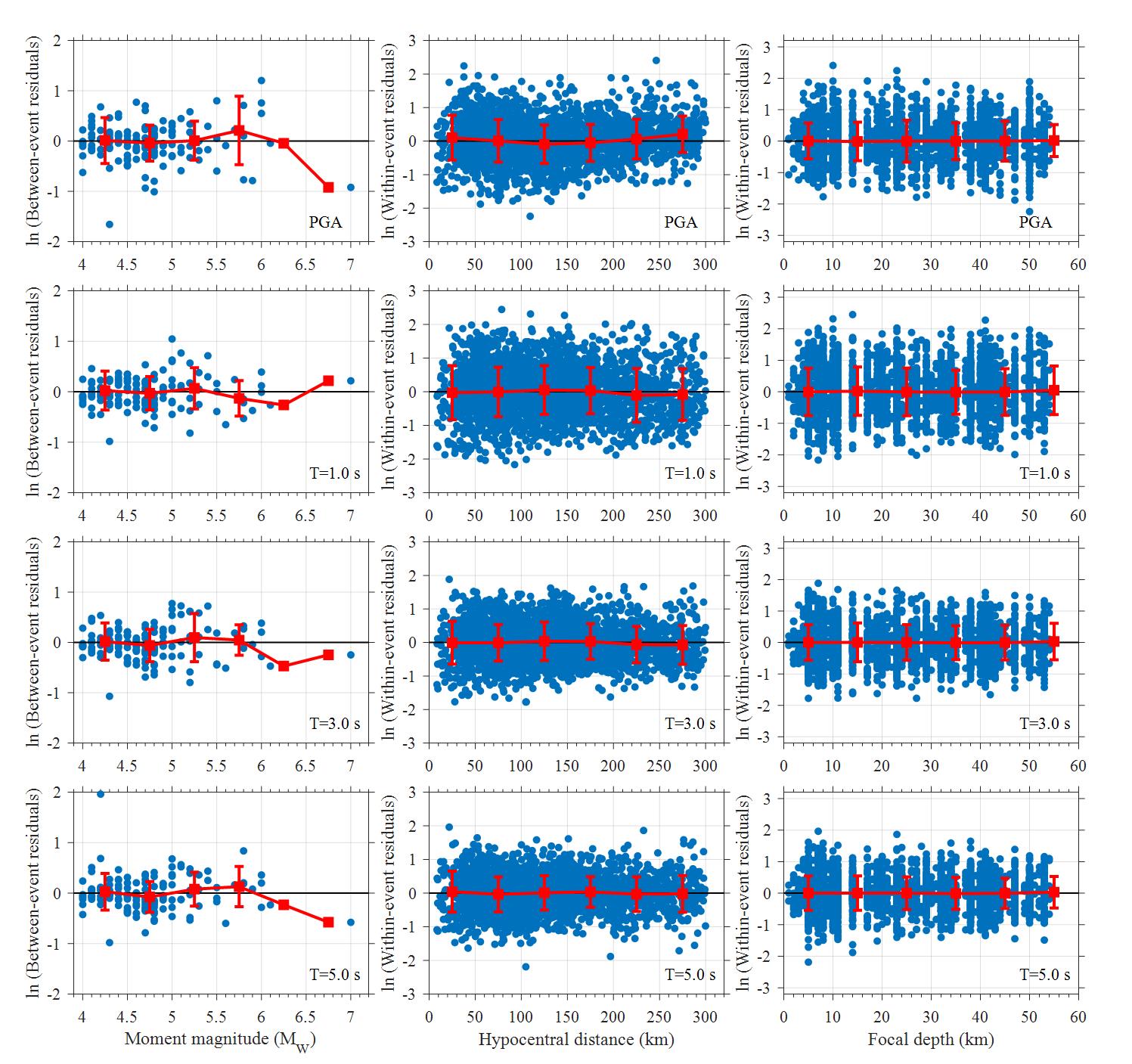 圖2 事件間殘差和事件內殘差對震級、震源距離和震源深度的分布圖