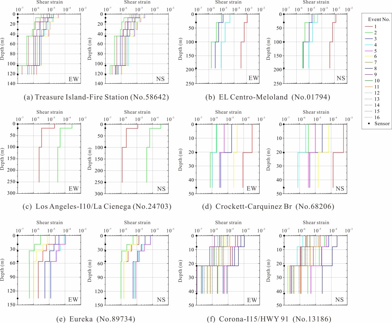 圖1. 本研究建立的6個(gè)巖土臺(tái)陣分別在EW和NS的剪切應(yīng)變剖面。
