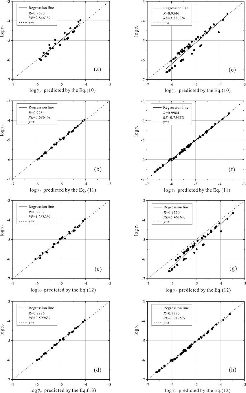 4 、對(duì)于II、III類(或D、E類)場(chǎng)地,與兩個(gè)相鄰強(qiáng)震儀之間峰值質(zhì)點(diǎn)速度和鉆孔法實(shí)測(cè)的剪切波速或/和中心深度組合相關(guān)的2個(gè)原位剪切應(yīng)變剖面模型能夠高精度地預(yù)測(cè)任一巖土臺(tái)陣的原位剪切應(yīng)變剖面。