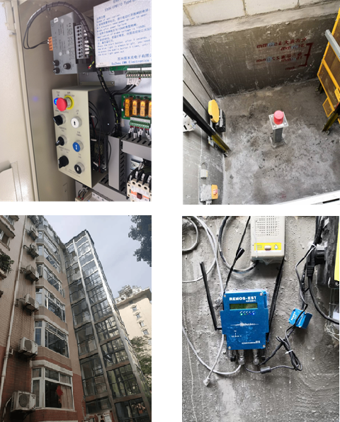 圖5 項目研發(fā)的電梯緊急地震開關(guān)及其在武漢尚隆地球村進(jìn)行示范應(yīng)用情況