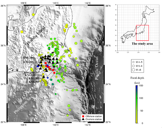 圖1 日本相模灣海底臺站、陸地臺站及地震震中分布圖